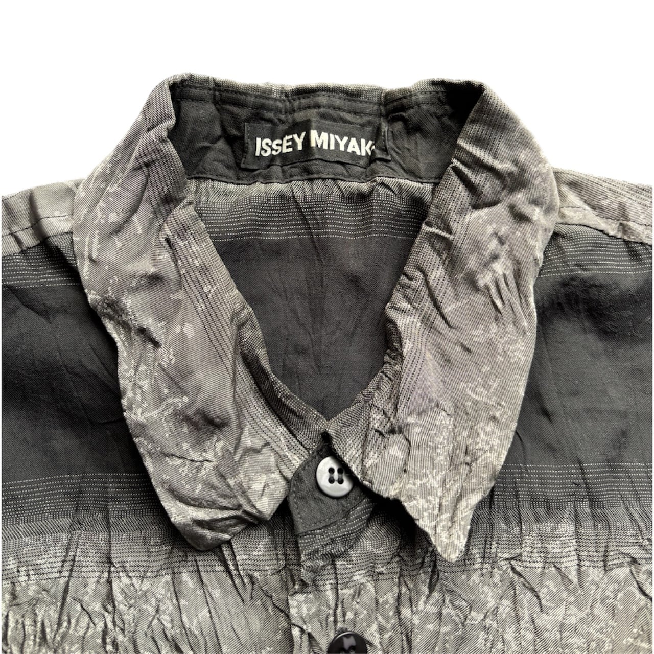 イッセイミヤケらしいワッシャー(自然なシワ感を出す)加工が施された水玉模様の切り替わったデザインのシャツです。