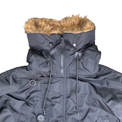 フードファーはボタンとドットボタンによりお好みで着脱が可能。フードのトップ部分には調整用ストラップが付いておりフードの微調整が可能です。フードの内側はボアになっており保温性に優れている様々なギミックの効いたカッコいいジャケットです。